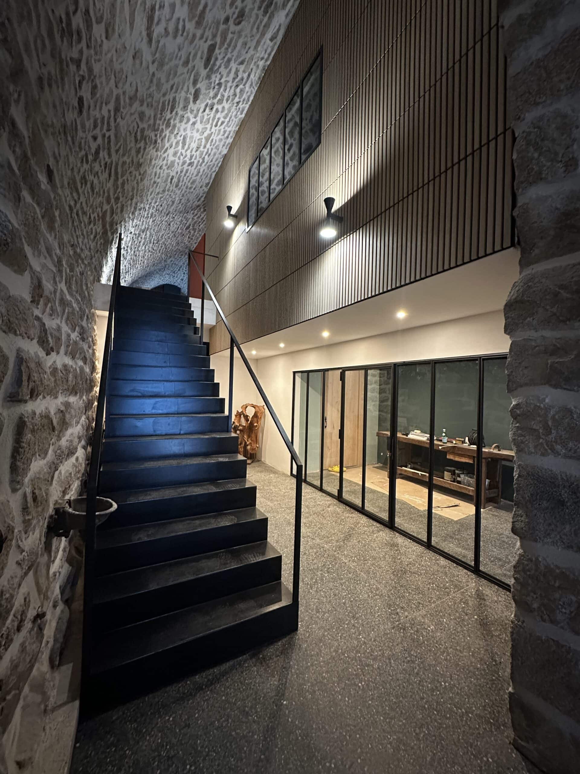 Sa ligne épurée et son garde-corps intégré mettent en valeur la pierre apparente du mur, créant un contraste harmonieux entre matériaux traditionnels et esprit industriel.