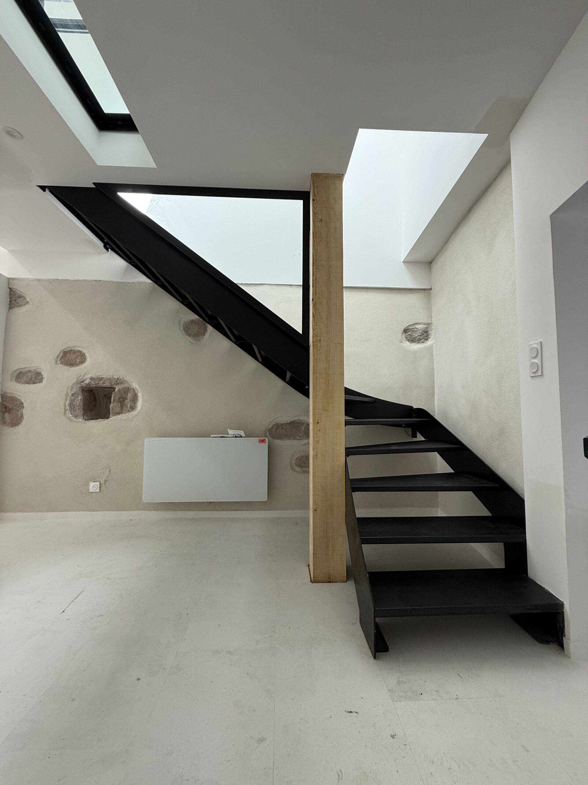 Sa ligne épurée et son garde-corps intégré mettent en valeur la pierre apparente du mur, créant un contraste harmonieux entre matériaux traditionnels et esprit industriel tout en sécurisant l’usage de l’escalier.